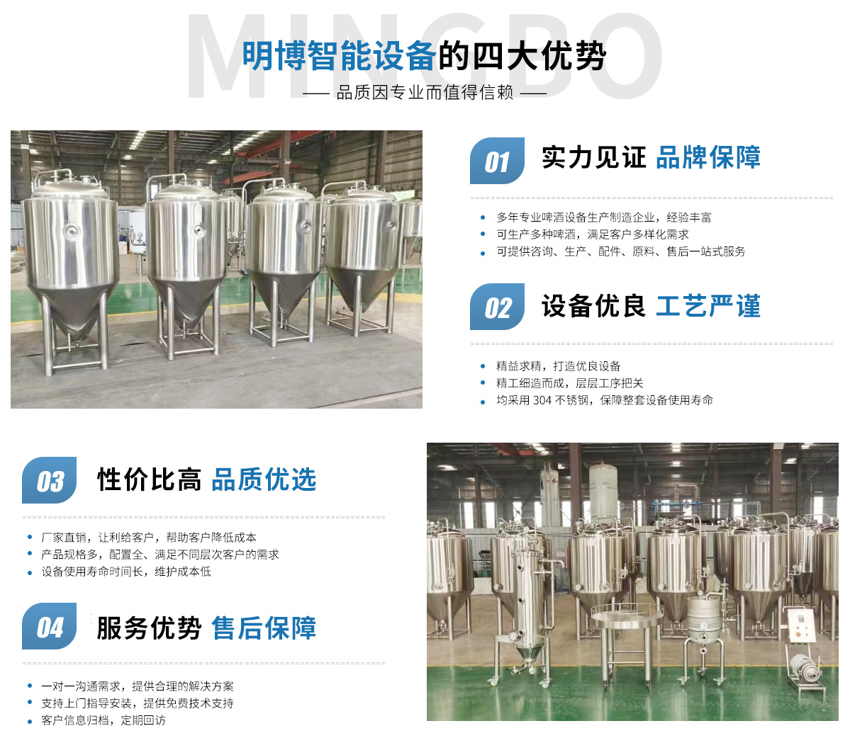 安徽明博智能設備有限公司位于安徽省宿州市宿馬園區馬鋼機械園2號廠房;我司擁有制造多年不銹鋼設備行業經驗,主推生產大中小型精釀啤酒設備、果酒設備、啤酒實驗設備、和提供釀酒技術支持的生產廠家。 公司經營范圍具體包含:食品、酒、飲料及茶生產專用設備制造;日用化工專用設備制造;制藥專用設備制造;環境保護專用設備制造;智能基礎制造裝備制造;金屬結構制造;制冷、空調設備制造;氣體壓縮機械制造銷售等;我們是集設...